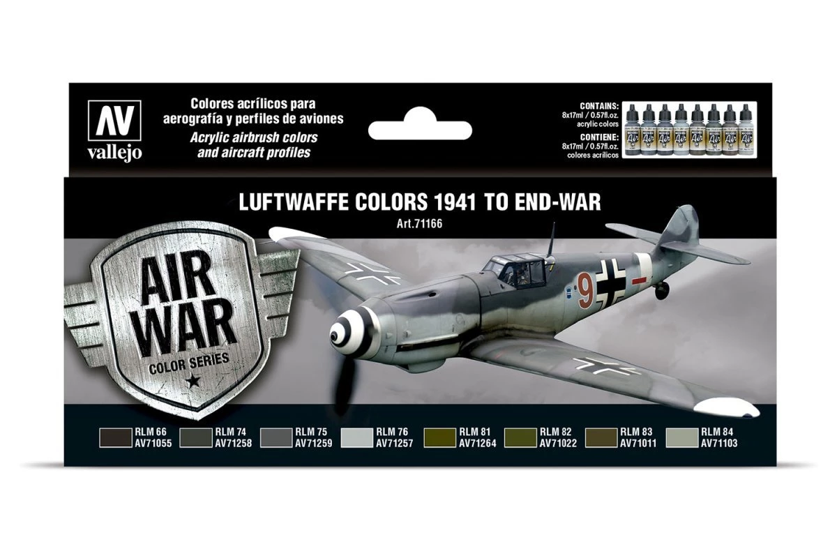 Set of Model Air colors developed for the camouflage patterns of all Luftwaffe models of fighters (single-engine, heavy and night fighters) starting in 1941, as well as the colors employed towards the end of the war (1944-45) on the latest models of interceptors, and on the revolutionary new jets and latest model aircraft.