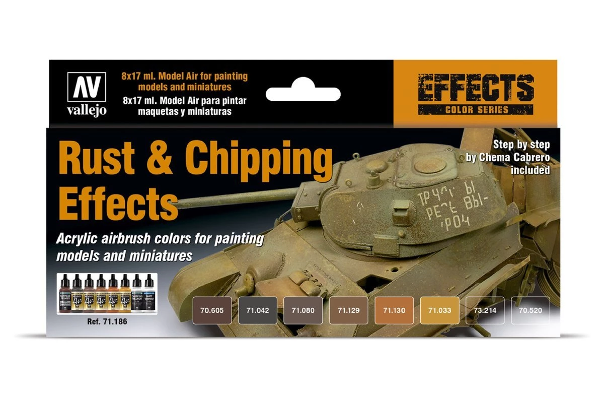 Selection of airbrush colors to create the effects of rust and wear caused by exposure to weather and battle conditions. Includes step by step by Chema Cabrero.