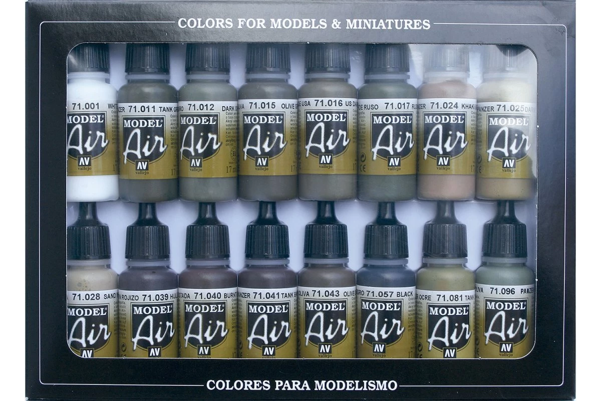Set of 16 Model Air references for painting models, figures and dioramas. Contains 17 ml./0.57 fl.oz. (with eyedropper) bottles and a color chart.