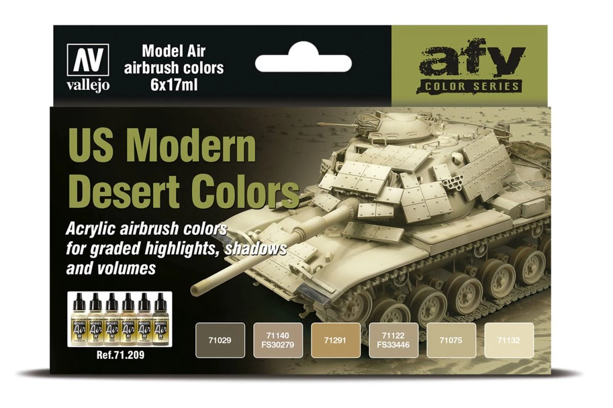 A set designed to show effects of light, shadow and volume on modern US AFV models as well as on other vehicles in a desert environment. The references included allow the application of several concepts such as panel and zenithal light or color modulation with transition from dark shadow to lighter tones, creating the perception of volume. The set includes step by step instructions to suggest the process of painting and highlighting.