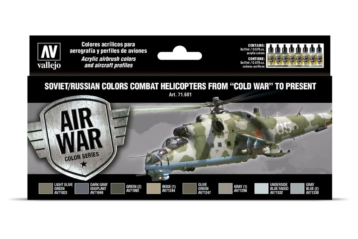 Set with Model Air colors developed to paint different models of helicopters of the Soviet Air Force and the actual Russian Federation during the “Cold War”. The setincludes profiles of the helicopters, and indications of the colors needed for thecamouflage schemes with a detailed description of their application.