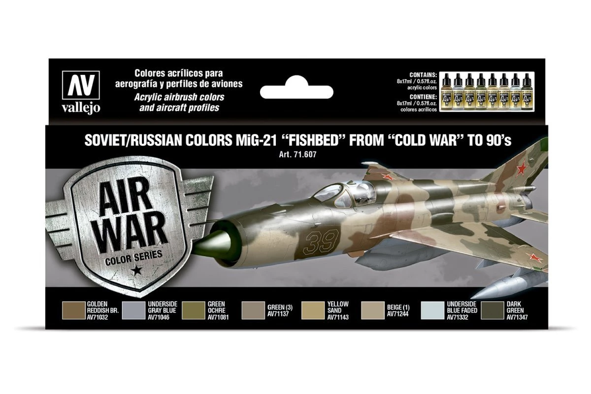 Set with Model Air color developed to paint the different models of the MiG-21 “Fishbed” of the Soviet Air Force during the “Cold War”. The set includes profiles of the aircraft, indications of the colors needed and a detailed description of their application.