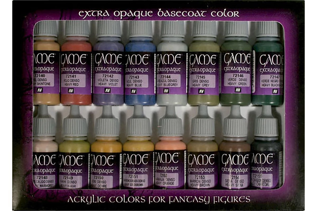 Set with 16 Extra Opaque Game Color for painting models and miniatures. This set has a specific selection of colors for painting vehicles, figures, etc. Contains 16 bottles of 17 ml./0.57 fl.oz. and a color chart.
