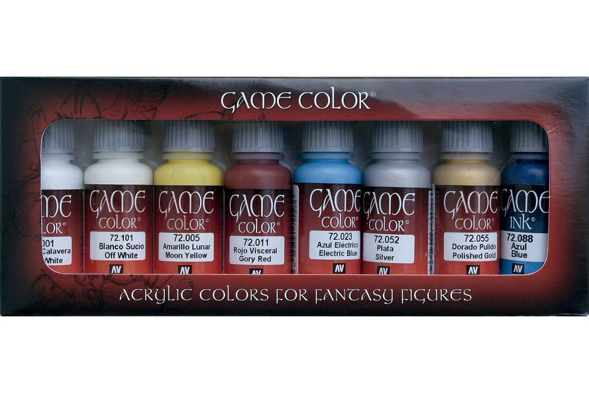 Set of 8 Game Color references for painting models and miniatures. Contains 17 ml./0.57 fl.oz. bottles and a color chart.